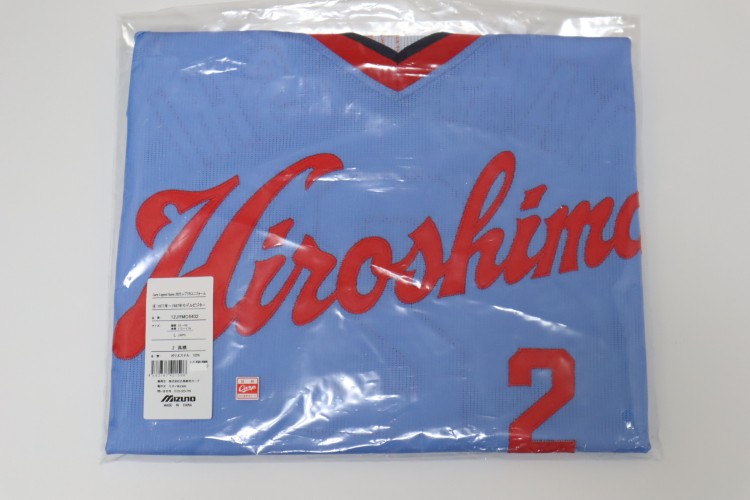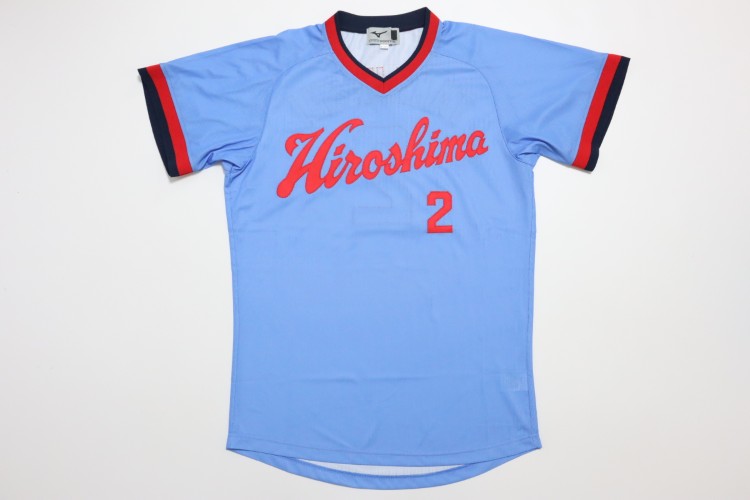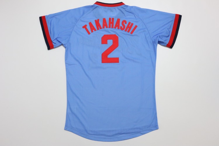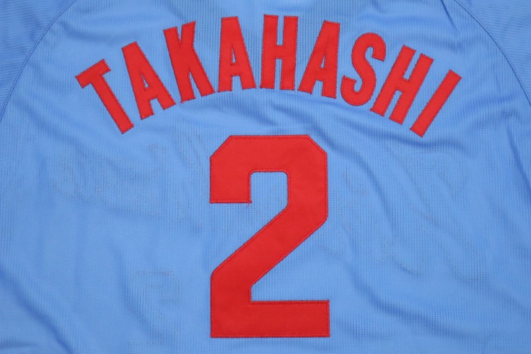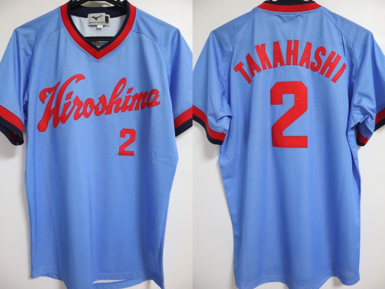 1977-1987 Hiroshima Toyo Carp away high quality remake jersey. All of the logos are embroidered on the jersey with Takahashi’s name and his number 2. Made in China, Mizuno Japan official licensed jersey.