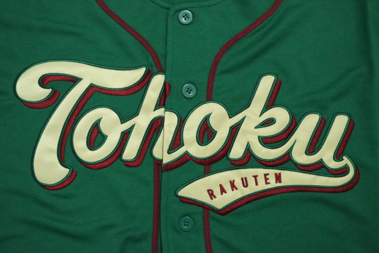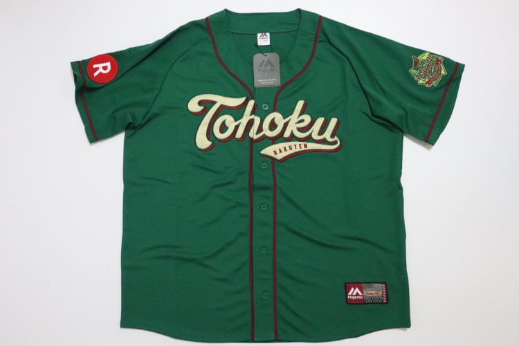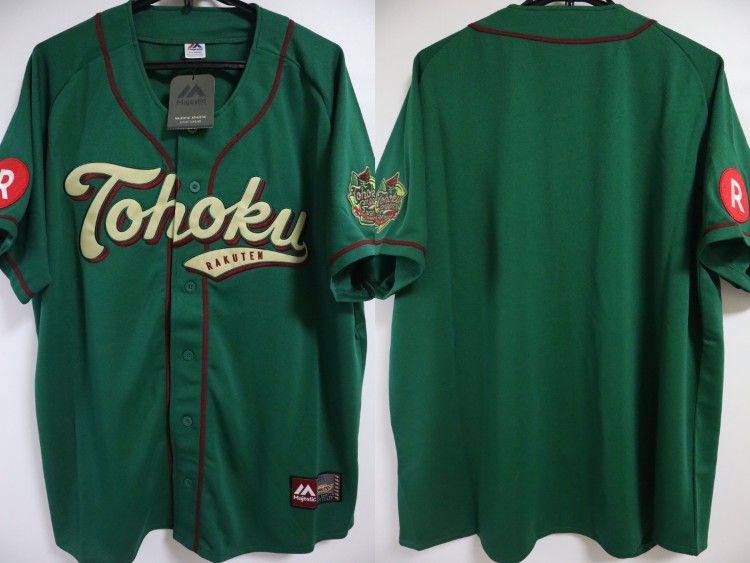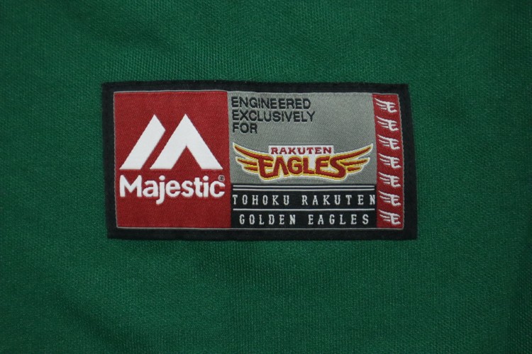 2014 Tohoku Rakuten Golden Eagles limited fourth jersey. All of the logos are embroidered on the jersey. Players worn this design of the jersey at only 13 limited matches, called Tohoku Green in 2014 season. Made in China, majestic Japan official licensed jersey.