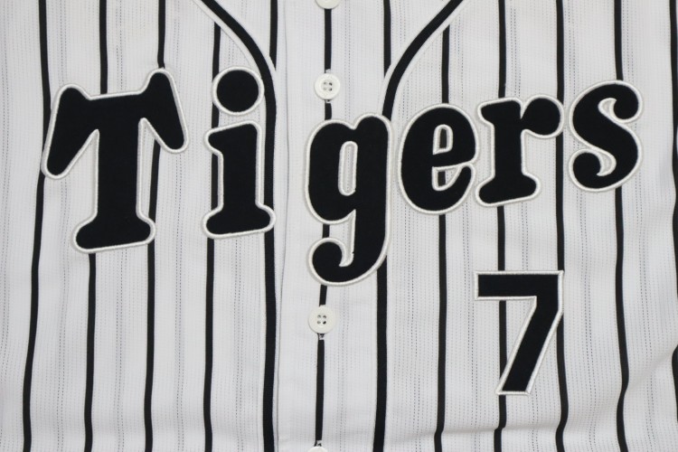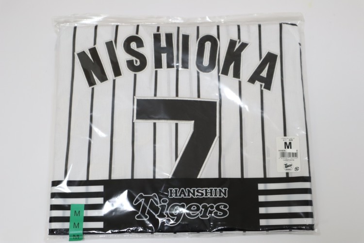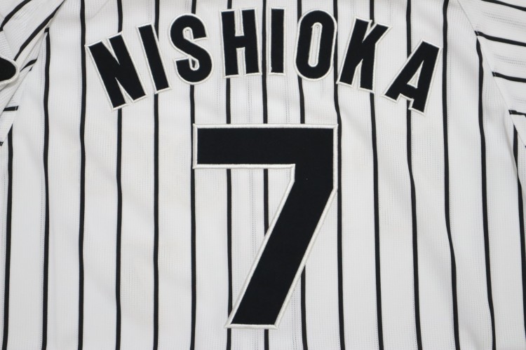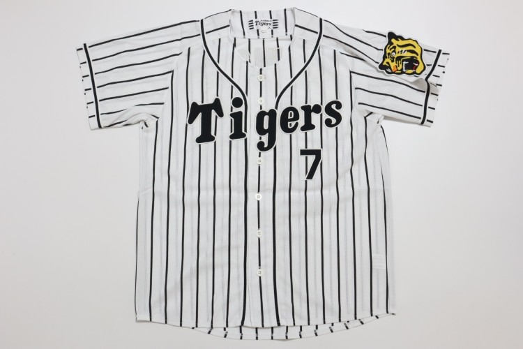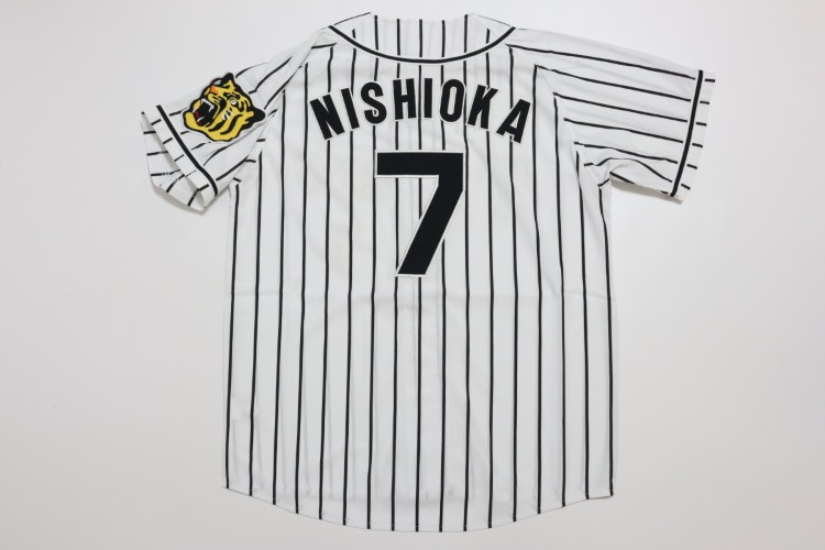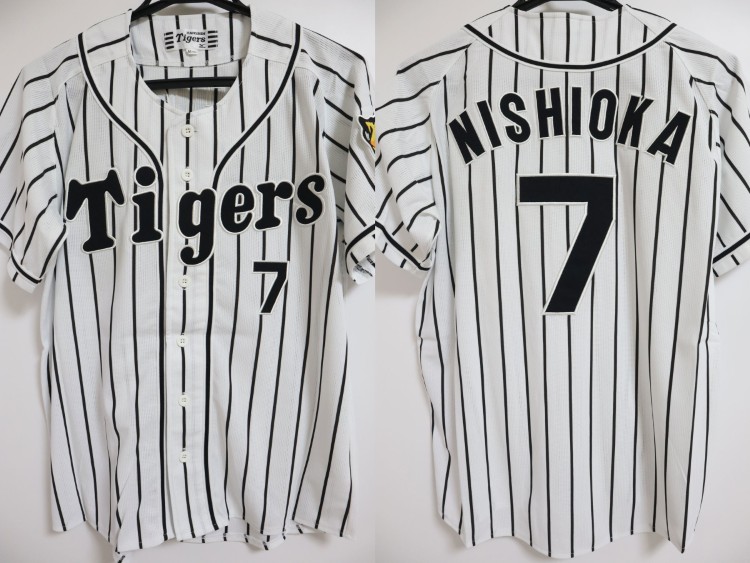 2015-2016 Hanshin Tigers home baseball jersey. All of the logos are embroidered on the jersey with Nishioka’s name and his number 7. Made in China, Mizuno Japan official licensed jersey.