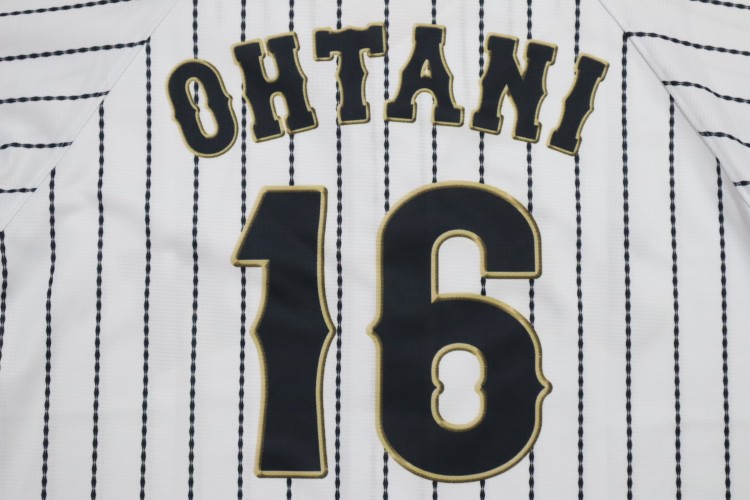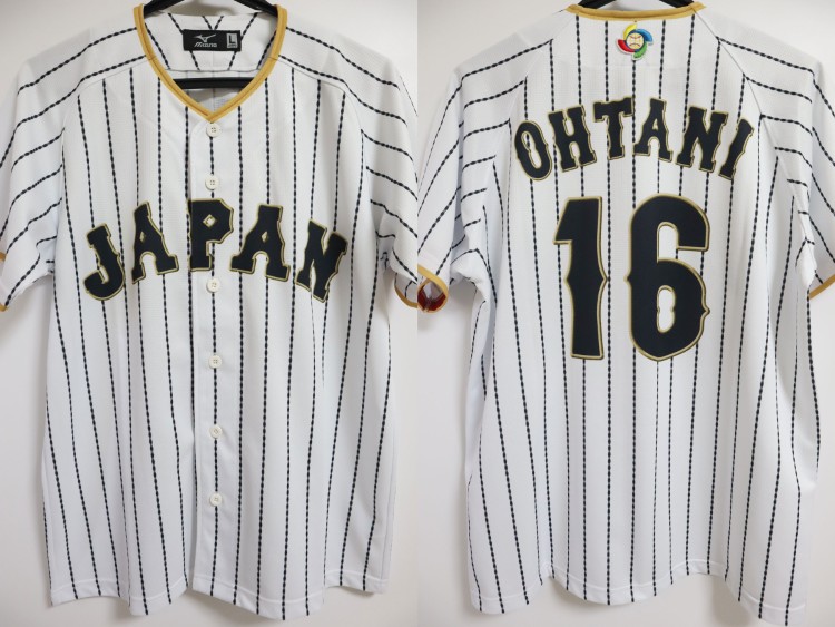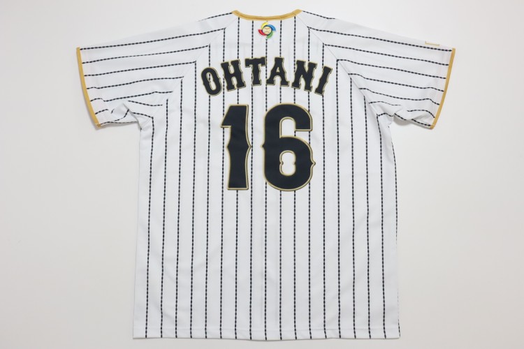 2016 Samurai Japan official baseball home jersey. Ohtani’s name and his number 16 are printed on the back. Logos are sublimation printing. Japan national team worn these type of jerseys at the 2017 World Baseball Classic. But he didn’t play in the tournament because of injury. Shohei worn this jersey at 2016 friendly matches against Mexico and Netherlands in 2016. Made in China, Mizuno Japan official licensed jersey.
