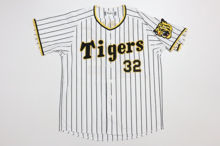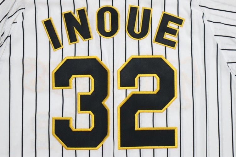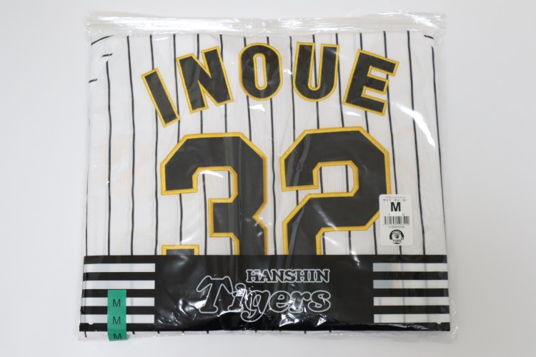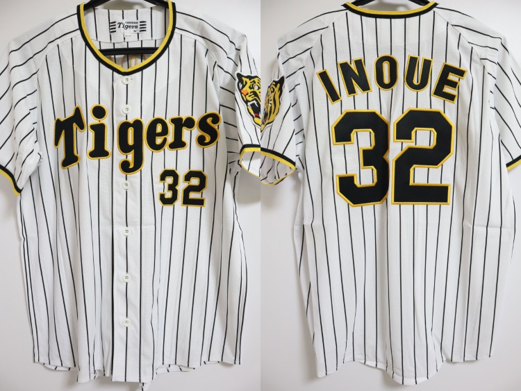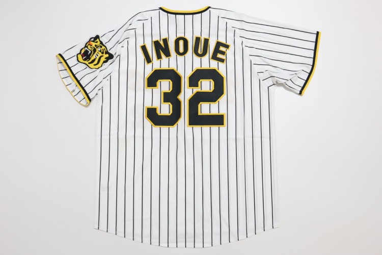 2022-2024 Hanshin Tigers home baseball jersey. All of the logos are embroidered on the jersey with Inoue’s name and his number 32. Made in China, Mizuno Japan official licensed jersey.