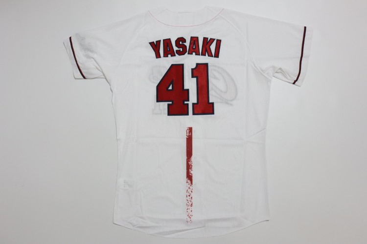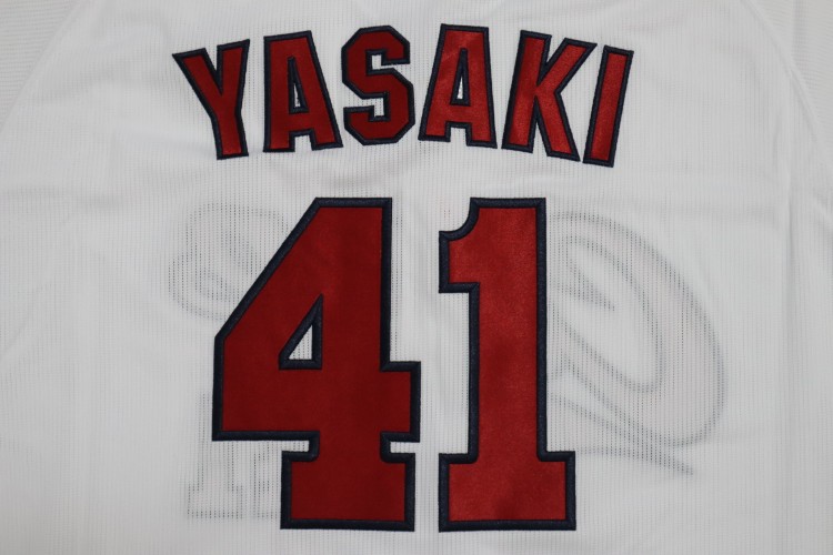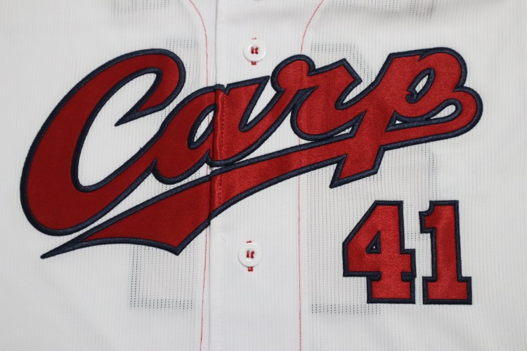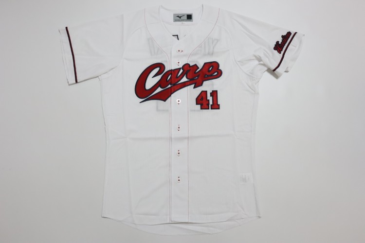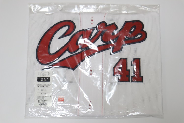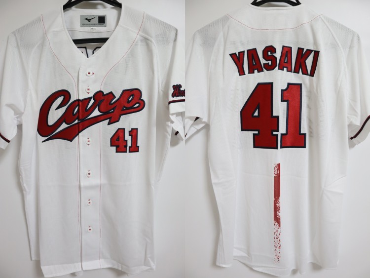 2023-2024 Hiroshima Toyo Carp home high quality jersey. All of the logos are embroidered on the jersey with Yasaki’s name and his number 41. Made in China, Mizuno Japan official licensed jersey.