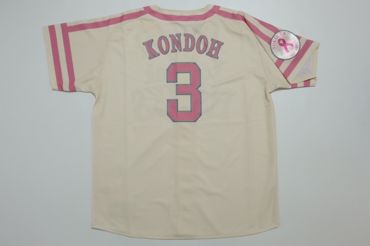 2025 Fukuoka SoftBank Hawks third jersey. Players wear this design of the cap only at 3 limited home matches for female supporters, called “Pinkful Day” in 2025 season. Kondoh’s name and his number 3 are printed on the back. They are sublimation print. Made in China, Majestic Japan official licensed jersey.