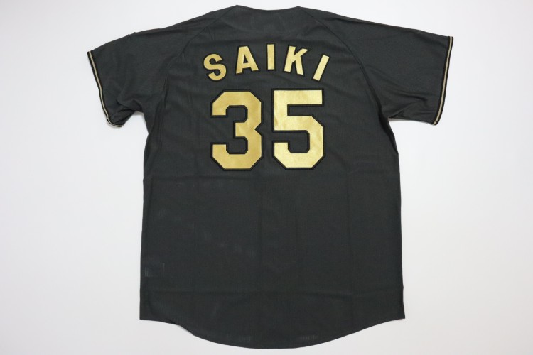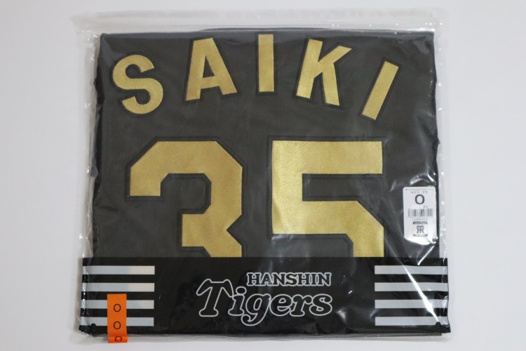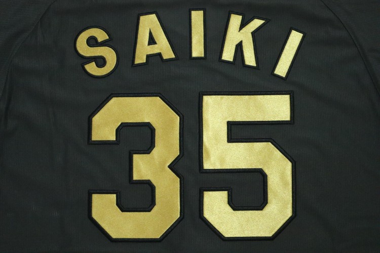 2025 Hanshin Tigers fifth baseball jersey. All of the logos are embroidered on the jersey with Saiki’s name and his number 35. Players wear this design of the jersey only at 5 limited home matches, called “Tigers B-Luck Dynamite Series 2025”. Made in China, Mizuno Japan official licensed jersey.