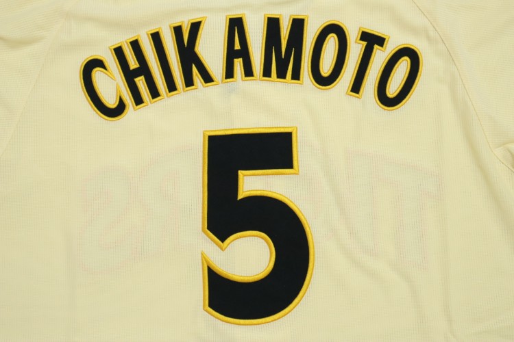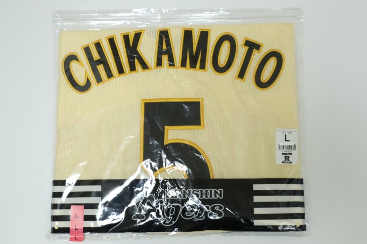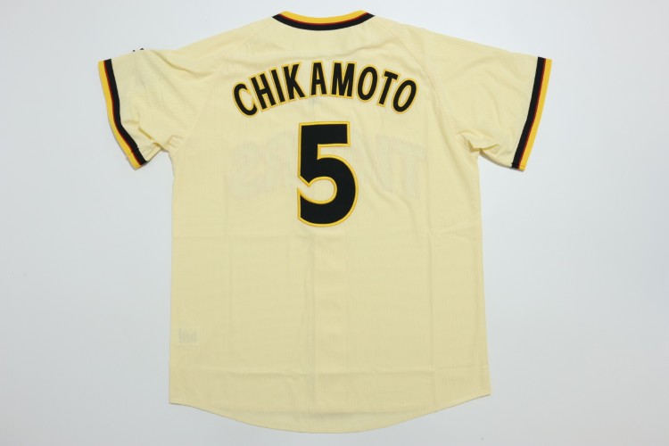 2025 Hanshin Tigers fourth baseball jersey. All of the logos are embroidered on the jersey with Chikamoto’s name and his number 5. Players wear this design of the jersey only at 3 limited home matches, called “Family with Tigers”. Made in China, Mizuno Japan official licensed jersey.