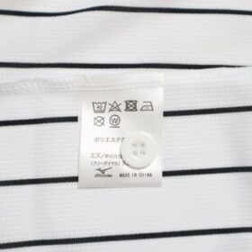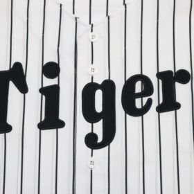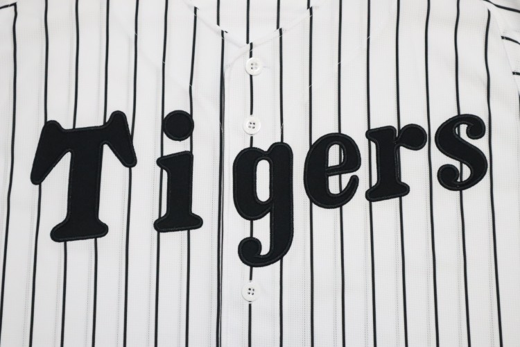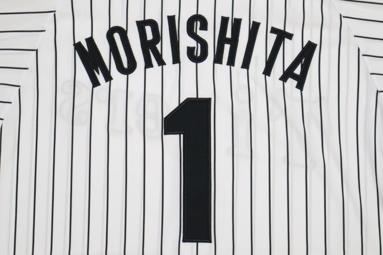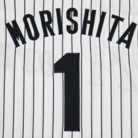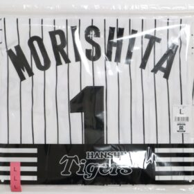2025 Hanshin Tigers home baseball jersey. All of the logos are embroidered on the jersey with Morishita’s name and his number 1. Made in China, Mizuno Japan official licensed jersey.