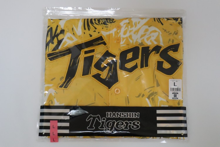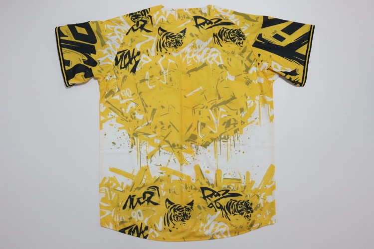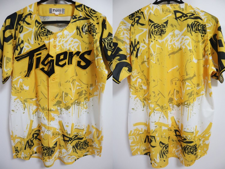 2025 Hanshin Tigers third baseball jersey. All of the logos are embroidered on the jersey. Made in China, Mizuno Japan official licensed jersey.