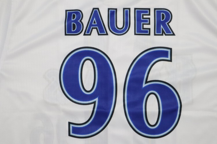 2025 Yokohama DeNA Baystars home jersey. All of the logos are printed on the jersey with Bauer’s name and his number 96. They are sublimation print. Made in China Baystars official licensed jersey.
