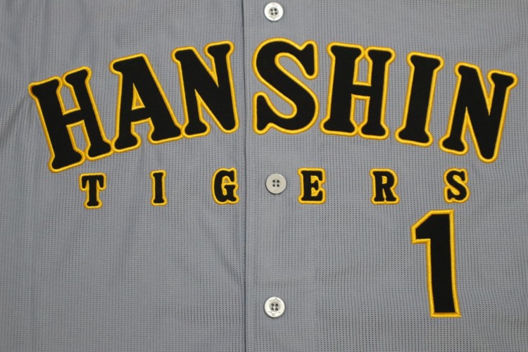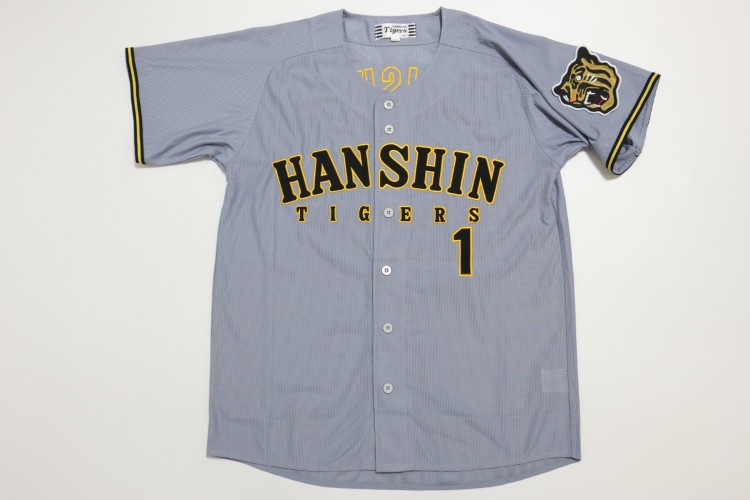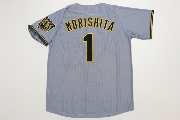 2026 Hanshin Tigers away baseball jersey. All of the logos are embroidered on the jersey with Morishita’s name and his number 1. Made in China, Mizuno Japan official licensed jersey.
