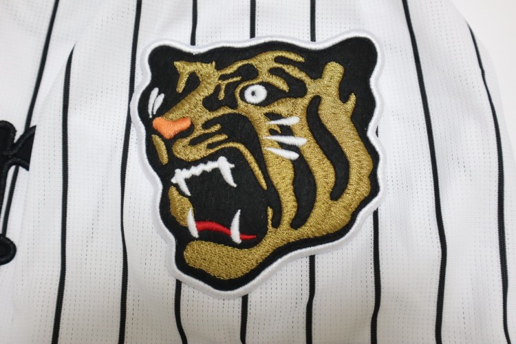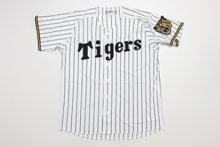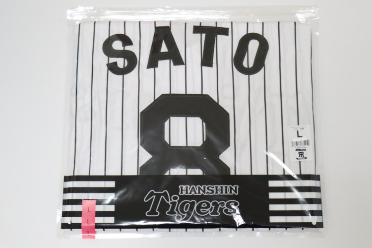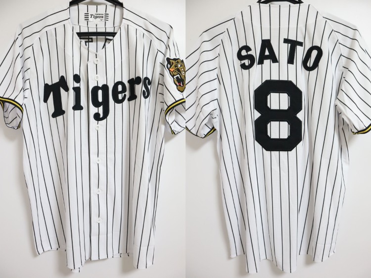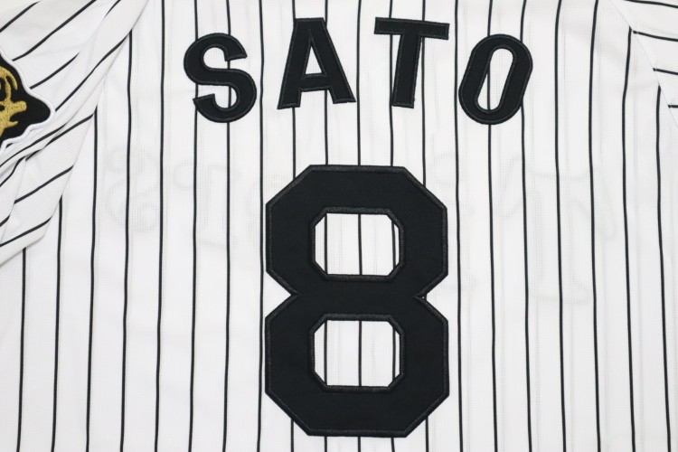 2026 Hanshin Tigers home baseball jersey. All of the logos are embroidered on the jersey with Sato’s name and his number 8. Made in China, Mizuno Japan official licensed jersey.